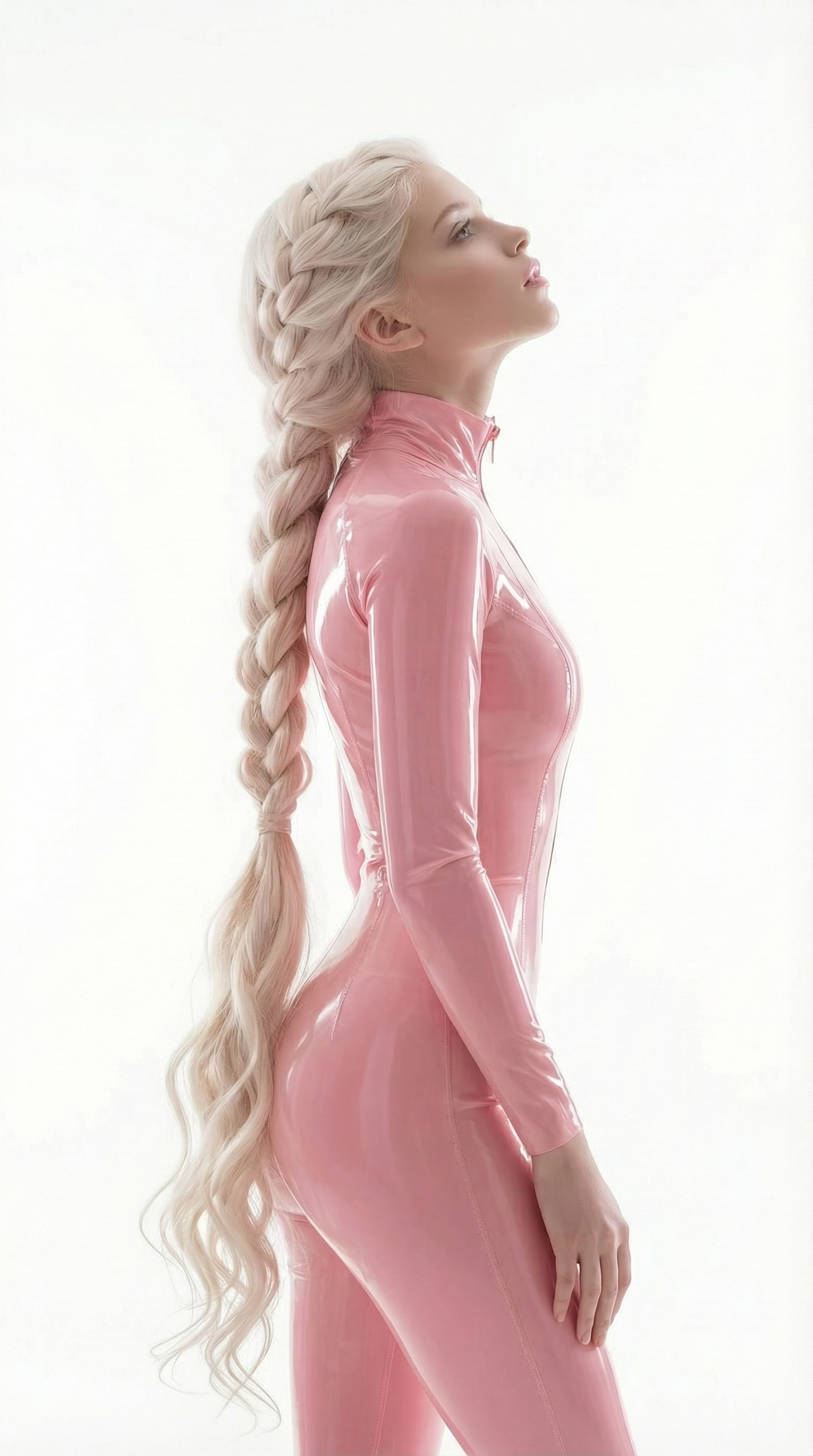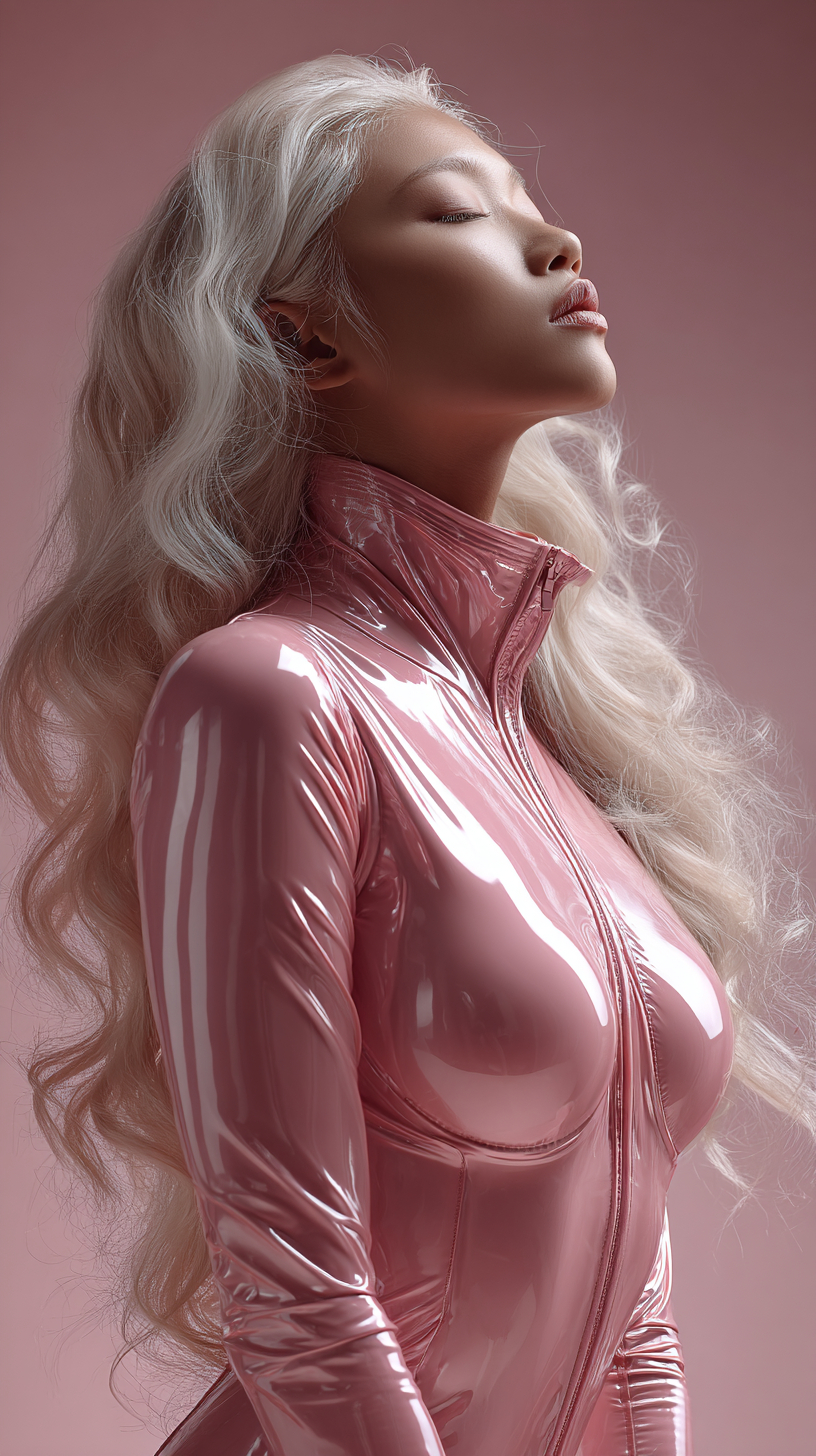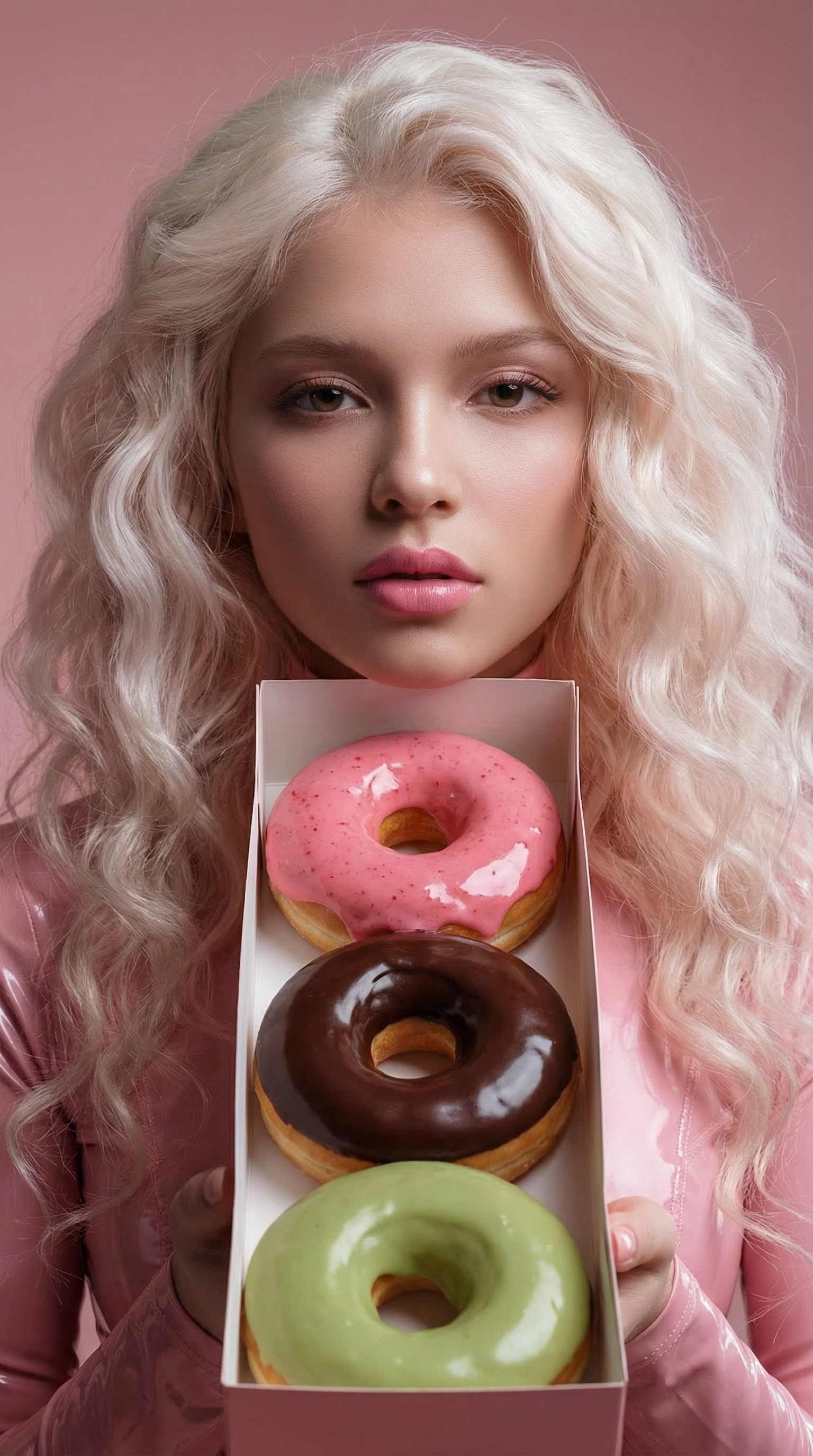 Fashion-серия в монохромной розовой эстетике — латексные боди, платиновые волосы, белый пудель и пончики как реквизит. Контент который работает на узнаваемость бренда и останавливает взгляд в ленте.